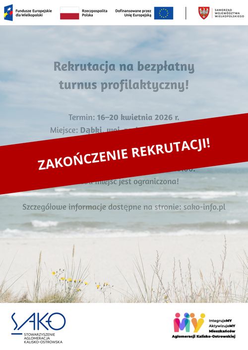 Stowarzyszenie Aglomeracja Kalisko-Ostrowska (SAKO) zaprasza do udziału w bezpłatnym wyjazdowym turnusie profilaktycznym organizowanym w ramach projektu „IntegrujeMY, AktywizujeMY mieszkańców Aglomeracji...