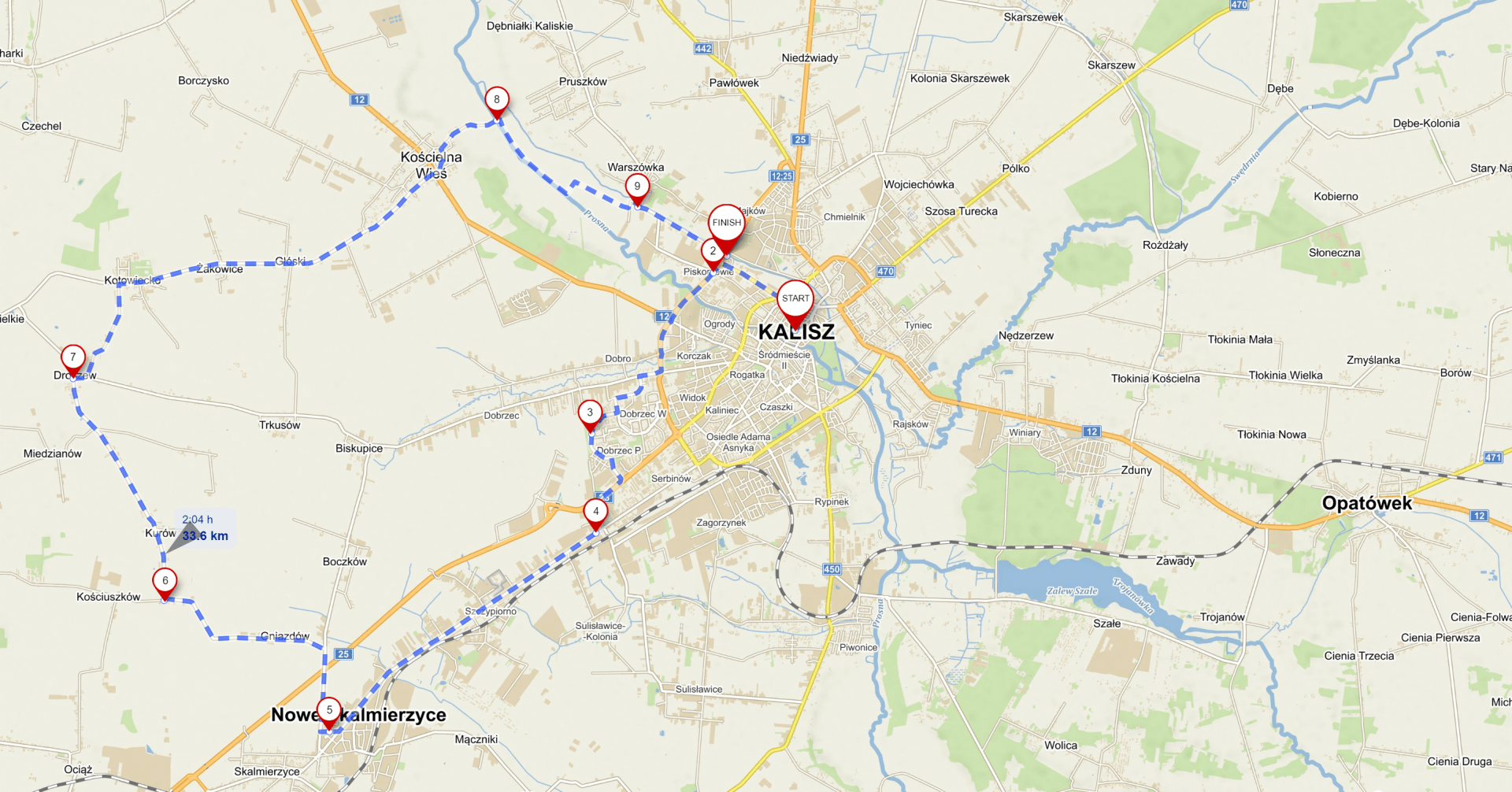 Start z Główny Rynek 20, ul. Złota do DK25, jedziemy ścieżką wzdłuż DK25 do ul. Dobrzeckiej, później ul. Aliny Szapocznikow, ul. Prymasa Stefana Wyszyńskiego, ul. Stanisława Wojciechowskiego, ul. Armii Krajowej do ul. Aleja Wojska Polskiego. Dalej wzdłuż ul. Aleja Wojska Polskiego do ul. Wrocławskiej. Dalej ścieżką przy ulicy ul. Wrocławskiej do miejscowości Nowe Skalmierzyce. Z miejscowości Nowych Skalmierzyc do miejscowości Boczków wiaduktem nad DK25, dalej do miejscowości Droszew, z miejscowości Droszew kierujemy się do miejscowości Kotowiecko, z miejscowości Kotowiecko jedziemy nowo wybudowaną ścieżką rowerową przez miejscowość Głóski, do miejscowości Kościelna Wieś. W miejscowości Kościelna Wieś przejeżdżamy na drugą stronę DK12 i jedziemy na tamę na rzece Prosna. Od tamy jedziemy drogą szutrową przy rzece aż do Kalisza, wjeżdżając prawie bezpośrednio na ulicę wał Bernardyński kierując się na metę ogródki działkowe Majków.