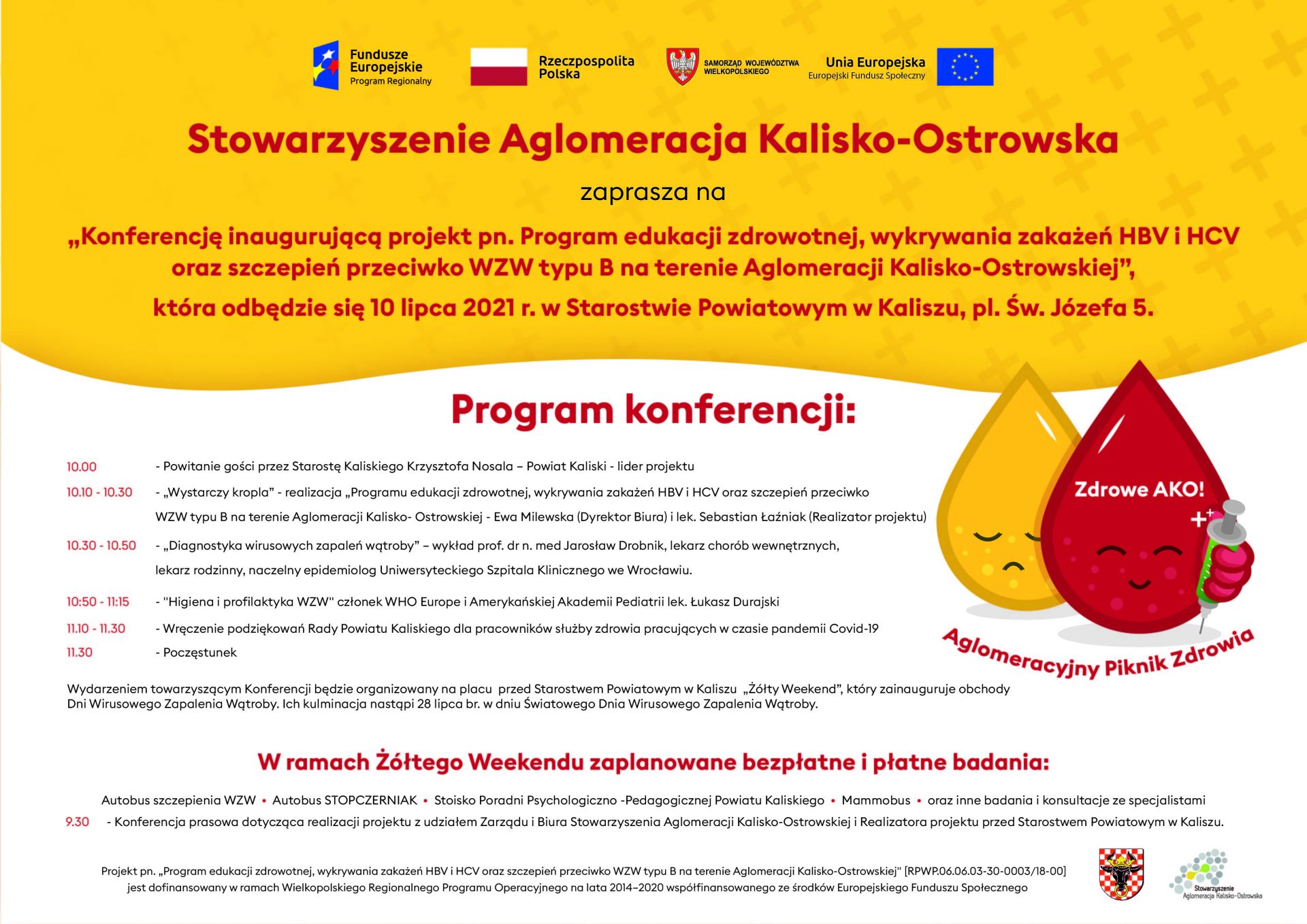Już w najbliższą sobotę tj. 10 lipca br. od godziny 9.30 zapraszamy na konferencję inaugurującą projekt pn. „Program edukacji zdrowotnej, wykrywania zakażeń HBV i HCV oraz szczepień przeciwko WZW typu B na terenie Aglomeracji Kalisko-Ostrowskiej”.